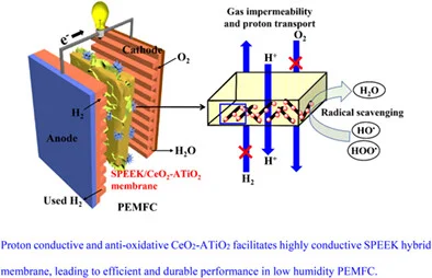 [4] Simultaneous improvement of power density and durability of sulfonated poly(ether ether ketone) membrane by embedding CeO2-ATiO2: A comprehensive study in low humidity proton exchange membrane fuel cells